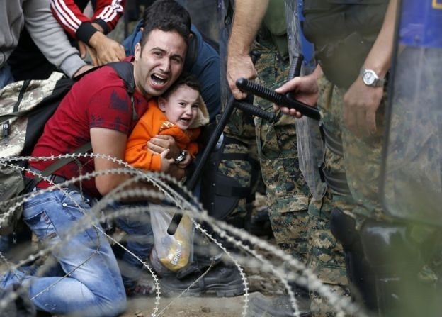 | Người đàn ông di cư ôm chặt con nhỏ, quỳ trước lực lượng an ninh Macedonia khi cố tìm đường vượt qua biên giới. Ảnh: AP |