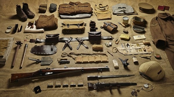 Quân trang của binh lính Anh ở trận Somme năm 1916 cho thấy sự đơn giản của một vài trang bị. Cùng với một mặt nạ phòng độc, người lính còn được cấp một cây gậy có gai sắt. Những đồ vật kỳ lạ hơn bao gồm xà cạp để quấn ống quần vào bắp chân, một hộp táo hầm. Ngoài ra còn có một đai da và một số túi da.