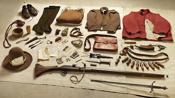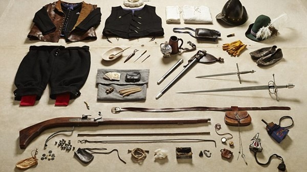 Các binh lính năm 1645 đánh trận Naseby được trang bị một thanh kiếm, một đôi giày lồng dây, một áo khoác đỏ của đội quân New Model Army, và một khẩu súng Matchlock Musket.