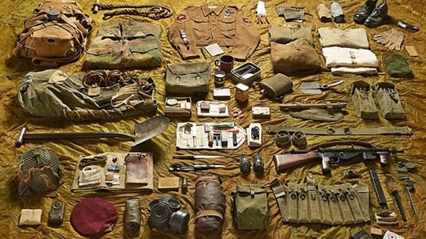 Một binh nhất thuộc Lữ đoàn nhảy dù trong trận Arnhem năm 1944 được trang bị túi dù và chiếc áo khoác rằn ri để ngụy trang. Những đồ vật khác bao gồm một lon nhôm, một cái cốc, chai đựng nước và một bộ khẩu phần ăn gồm một lon thịt bò và ngô, kẹo ngọt và một miếng chocolate.