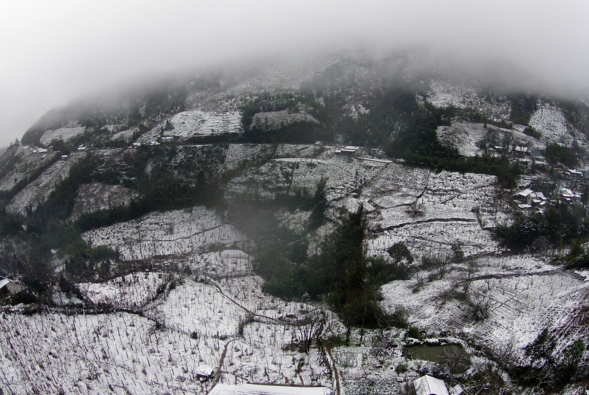 Quan sát từ độ cao 200m mới thấy tất cả các ngọn núi ở vùng cao này đều chìm trong mây, sương và tuyết.