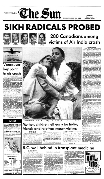 | Tờ Vancouver Sun (Canada) đưa tin về vụ khủng bố gây chấn động thế giới năm 1985. BBC nhận định, đây là vụ tấn công đẫm máu nhất xảy ra trên một máy bay trong lịch sử. Giới chức an ninh cho rằng, thủ phạm có thể là những phần tử cực đoan theo đạo Sikh. Ảnh: Vancoucer Sun |