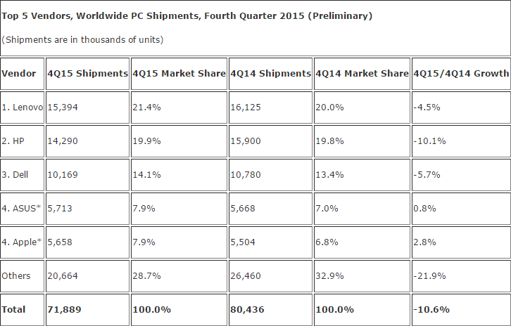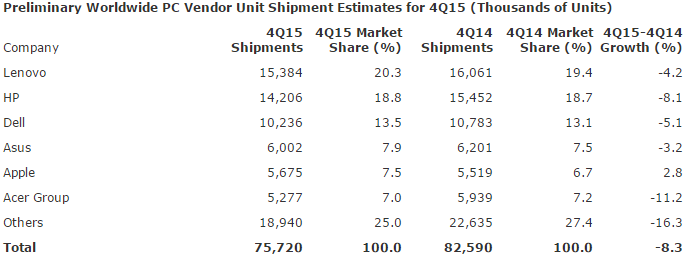 Gartner ước tính, doanh số PC toàn cầu giảm 8,3%, xuống còn 75,7 triệu chiếc bán ra trong quý IV/2015. Top 5 nhà sản xuất lớn nhất là Lenovo, HP, Dell, Asus và Apple. Theo Gartner, Apple là công ty duy nhất trong top đầu có doanh số PC xuất xưởng tăng, ở mức 2,8%.