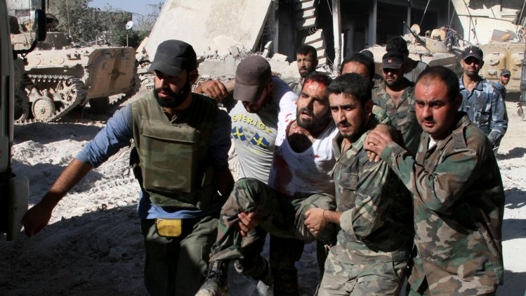 | Nhóm binh sĩ Syria đưa một đồng đội bị thương ra khỏi khu vực chiến sự trong cuộc giao tranh với chiến binh đối lập ở quận Jobar ở phía đông thủ đô Damascus hôm 24/8. Ảnh: AP. |