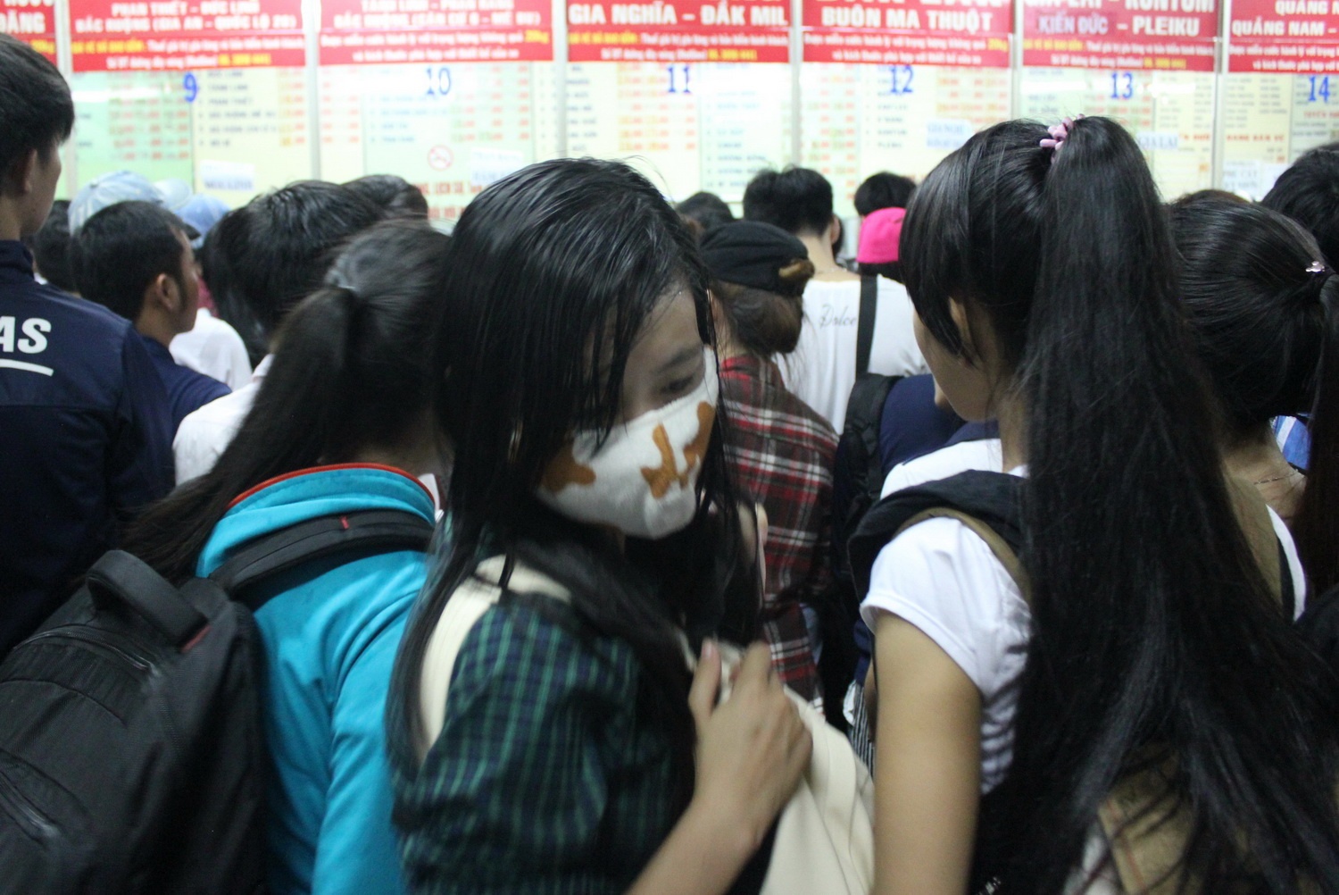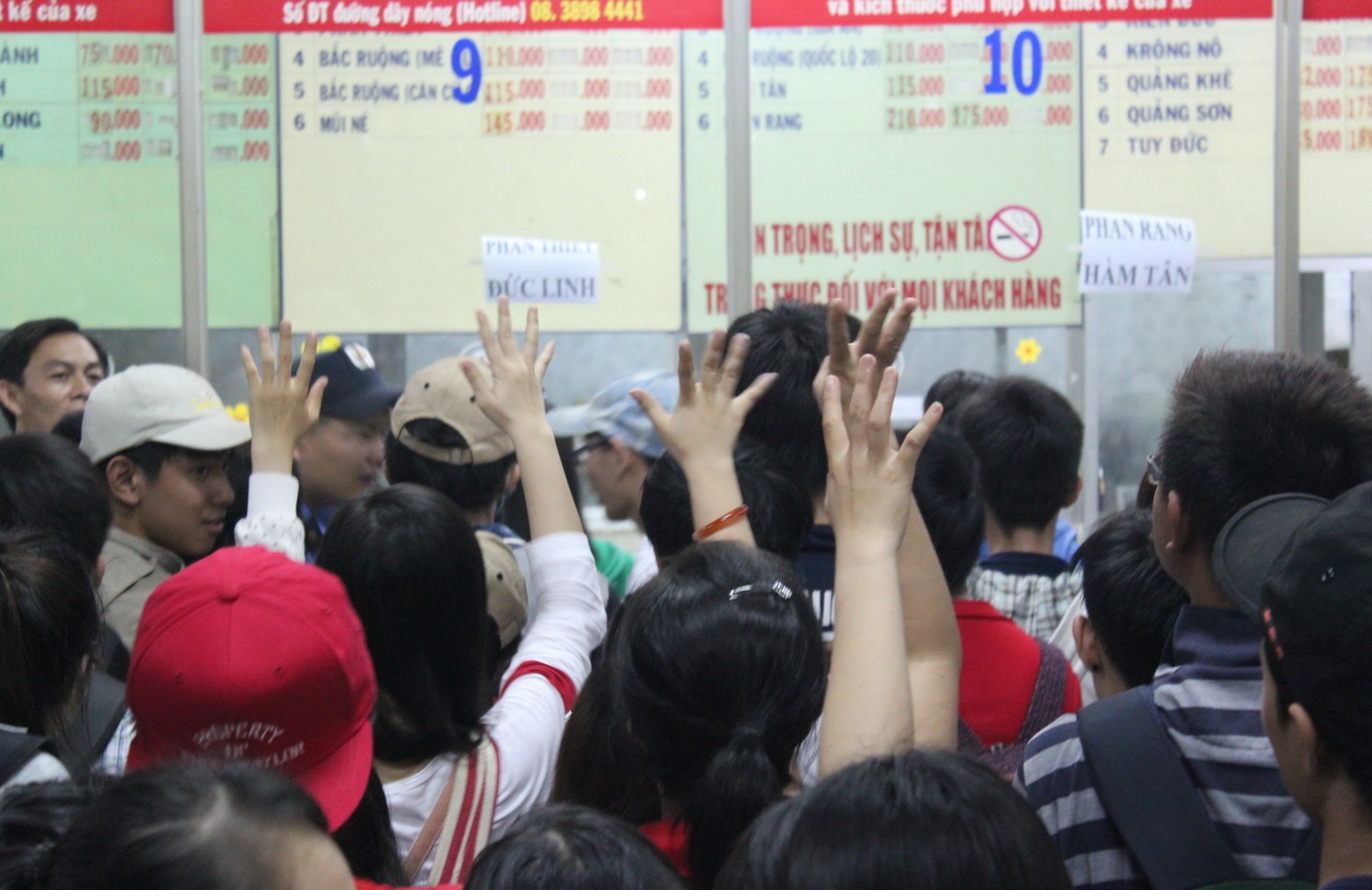 Tại khu vực bán vé xe ủy thác đi các tỉnh Tây Nguyên, miền Trung rất đông người chờ mua vé. |