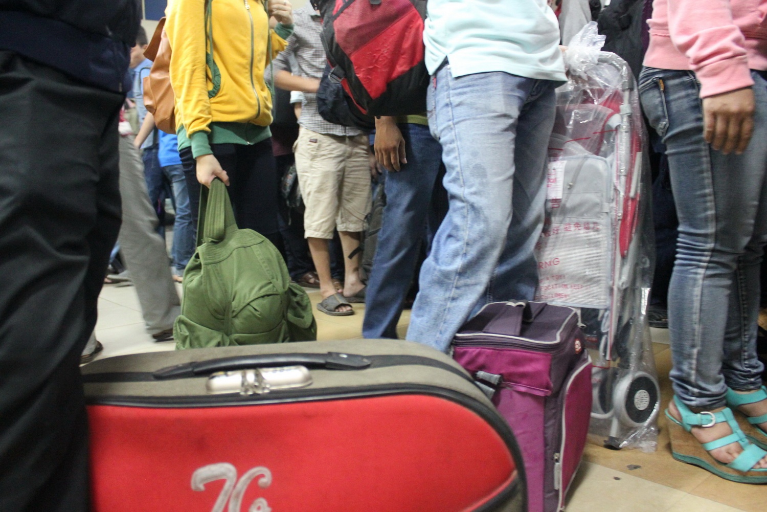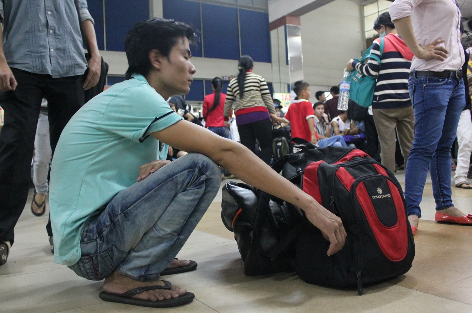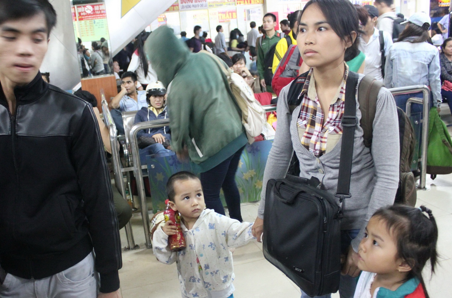 | Nhiều người mang đồ đạc lỉnh kỉnh khiến việc mua vé càng khó khăn hơn. |