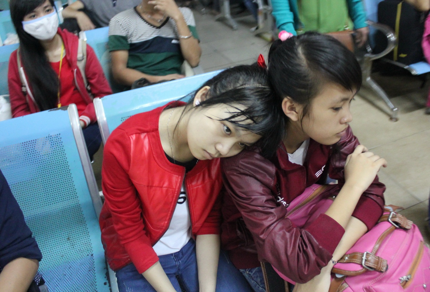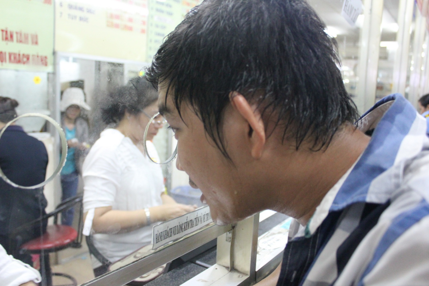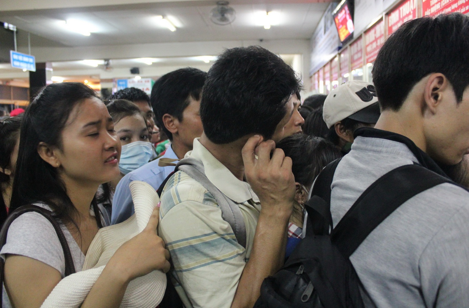 | Thời tiết Sài Gòn cuối giờ chiều dịu mát nhưng bên trong bến xe Miền Đông thì rất nóng bởi nhiều người xếp hàng, xô đẩy nhau. Không ít người toát mồ hôi khi đứng xếp hàng. |