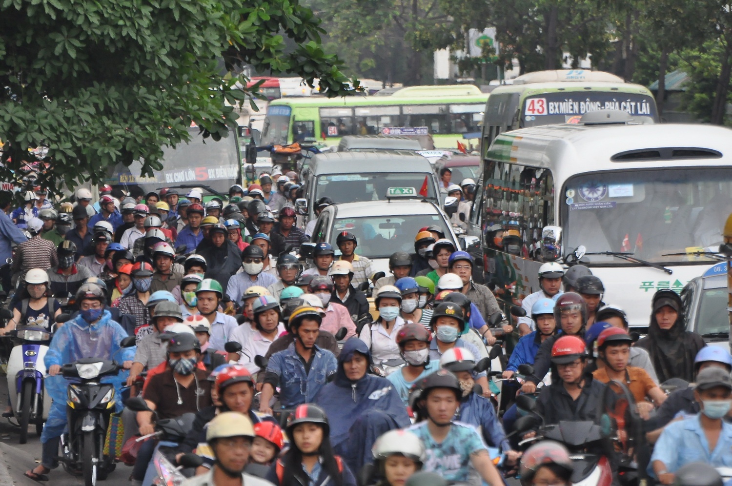 Chiều tối 29/4, các ngã đường dẫn vào bến xe Miền Đông (quận Bình Thạnh) bị kẹt cứng bởi dòng người đổ về để mua vé xe về quê. |