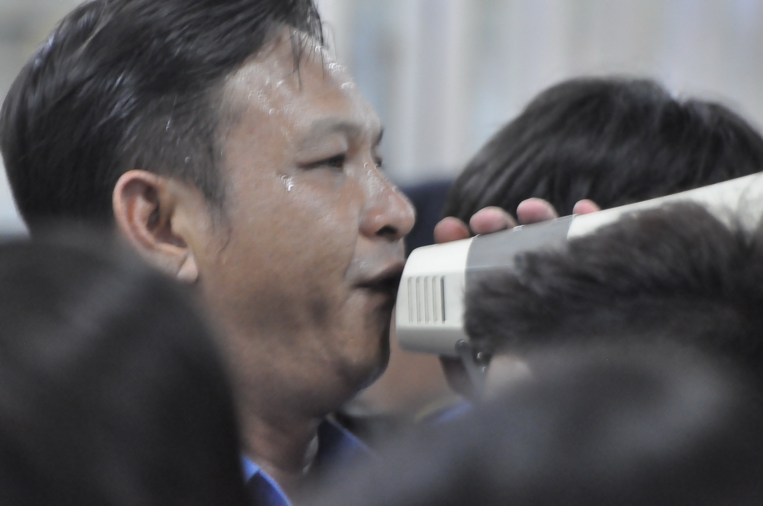 | Bảo vệ phối hợp với nhân viên phòng vé yêu cầu những người đi cùng tuyến giơ tay để nhận vé một lượt. |