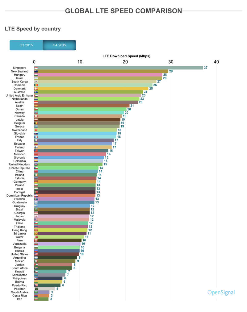 Tốc độ 4G LTE trung bình của thế giới là 13,5 Mbps. Singapore trở thành quốc gia cung cấp mạng LTE nhanh nhất với tốc độ download đạt 40 Mbps, độ bao phủ ở mức 86%.
