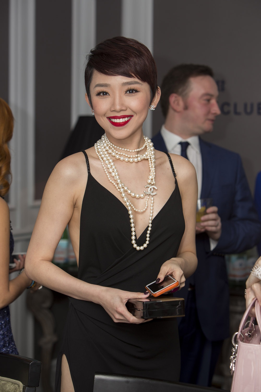 | Để góp mặt tại sự kiện này, Tóc Tiên chuẩn bị trang phục kỹ lưỡng. Cô diện bộ đầm tông đen gợi cảm, có đường cắt xẻ táo bạo tại chân váy. Phụ kiện chuỗi hạt Chanel thêm phần sang trọng. Nữ ca sĩ trang điểm hoàn hảo với phong cách quyến rũ. Trang phục đẹp giúp cô tự tin giao lưu với các khách mời góp mặt ở sự kiện. |
