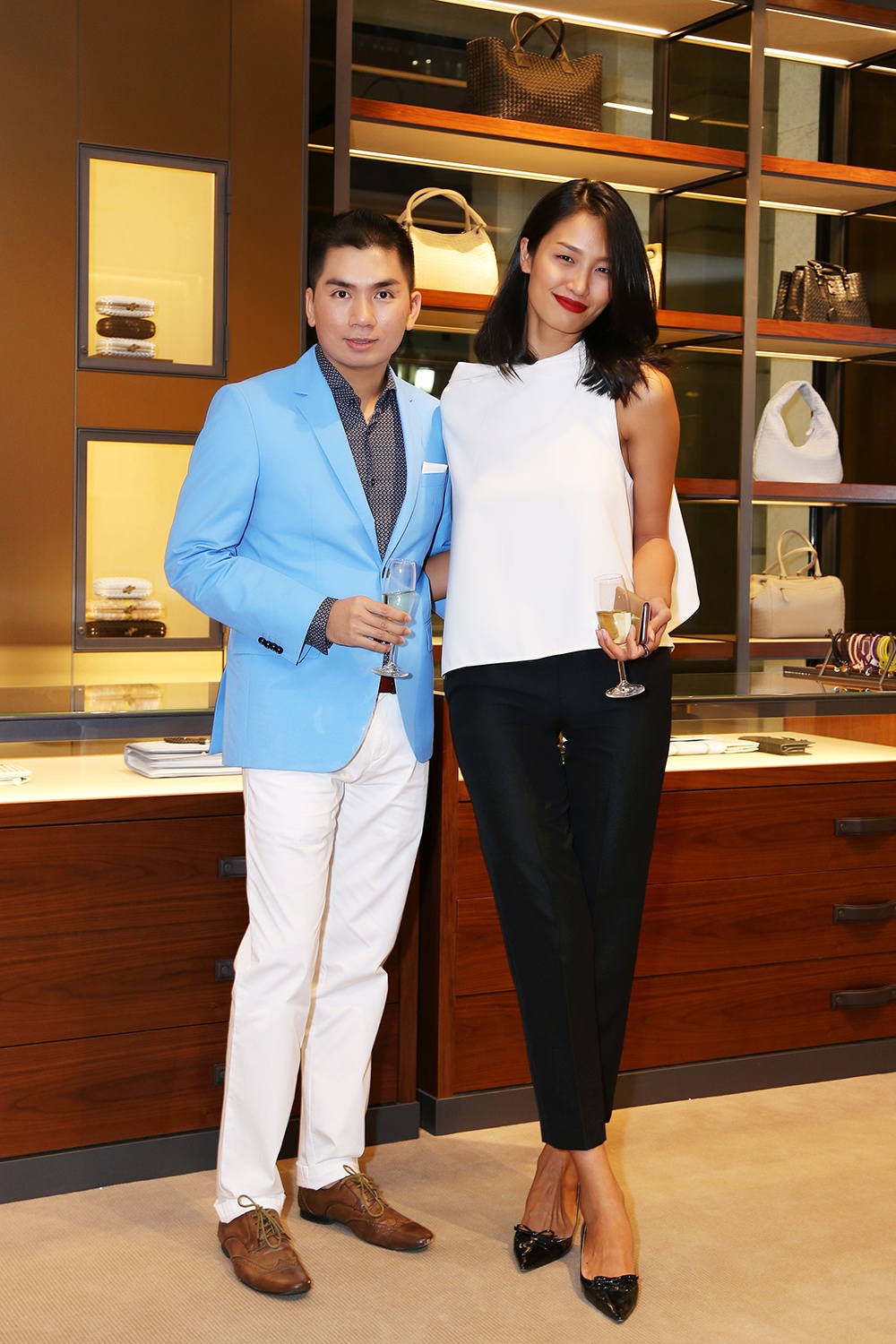 | Nhà thiết kế Adrian Anh Tuấn xuất hiện cùng hôn phu là doanh nhân Sơn Đoàn. Cặp đôi từng trở thành tâm điểm của showbiz Việt dịp đầu năm 2015 với đám cưới lãng mạn trên bãi biển Nha Trang. |