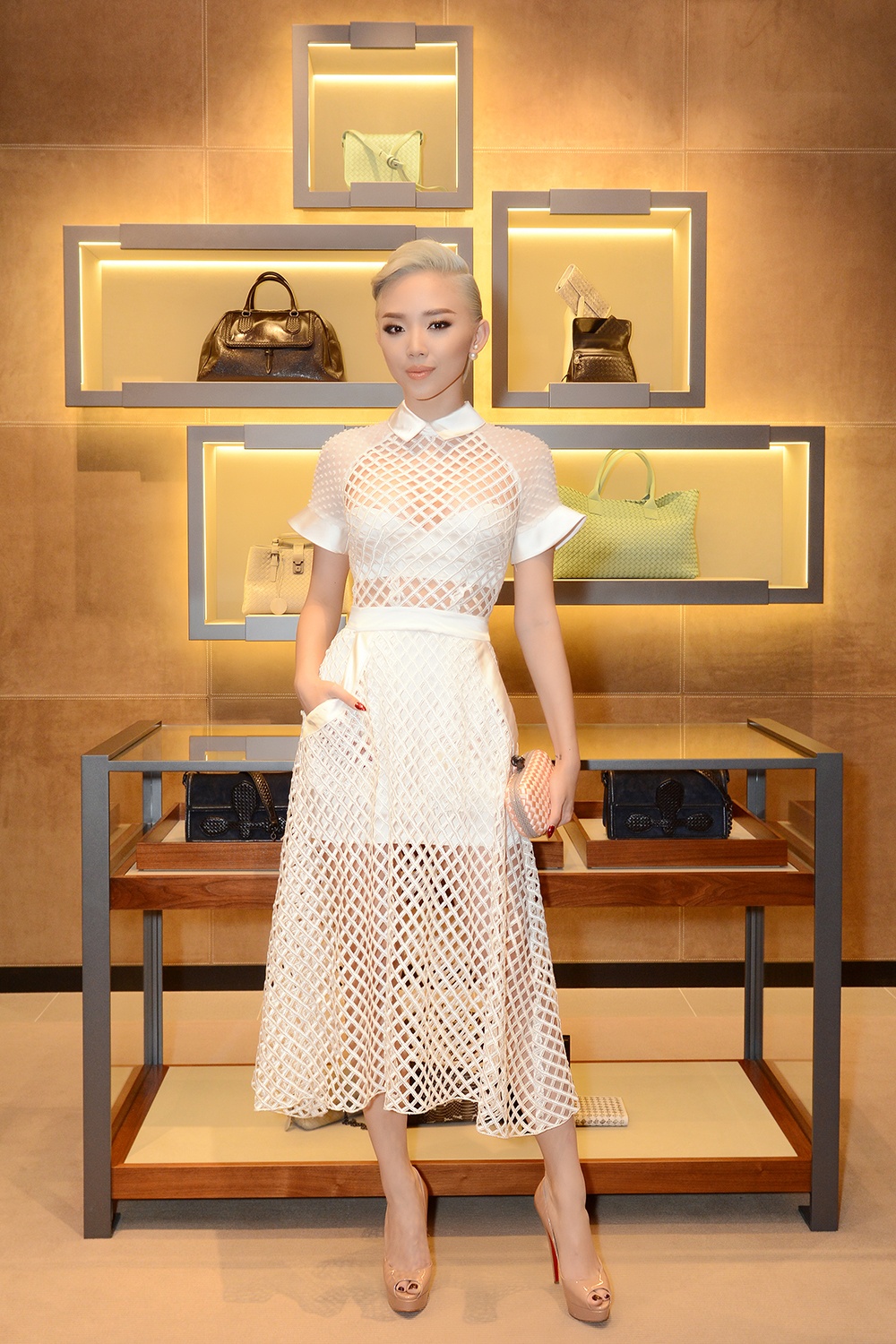 | Tóc Tiên diện trang phục luới xuyên thấu của Lý Quí Khánh. Trang phục độc đáo kết hợp với mái tóc mới mẻ giúp cô trở thành tâm điểm chú ý của sự kiện. |