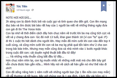 Vài ngày trước, một người bạn khuyên nữ ca sĩ đừng giận mẹ nữa. Nhưng dưới góc nhìn của nữ ca sĩ thì hai mẹ con "chỉ cần thời gian thật nhiều để những nỗi buồn tan đi mà thôi". Nhìn lại câu chuyện của cha con thí sinh The Voice Kids, Tóc Tiên chia sẻ dự định hâm nóng tình mẹ con bắt đầu từ những công thức nấu ăn tuyệt vời của mẹ.