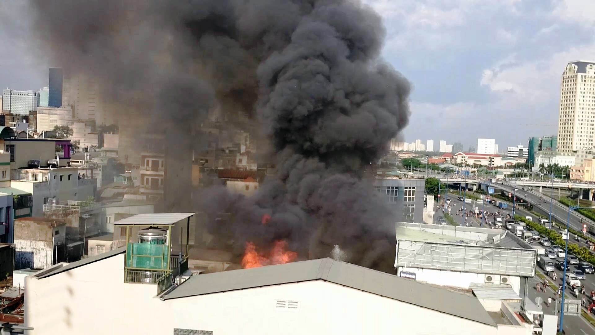 | Khói lửa bốc cao trong hỏa hoạn tại khu chợ Gà Gạo, quận 1. Ảnh: CTV. |