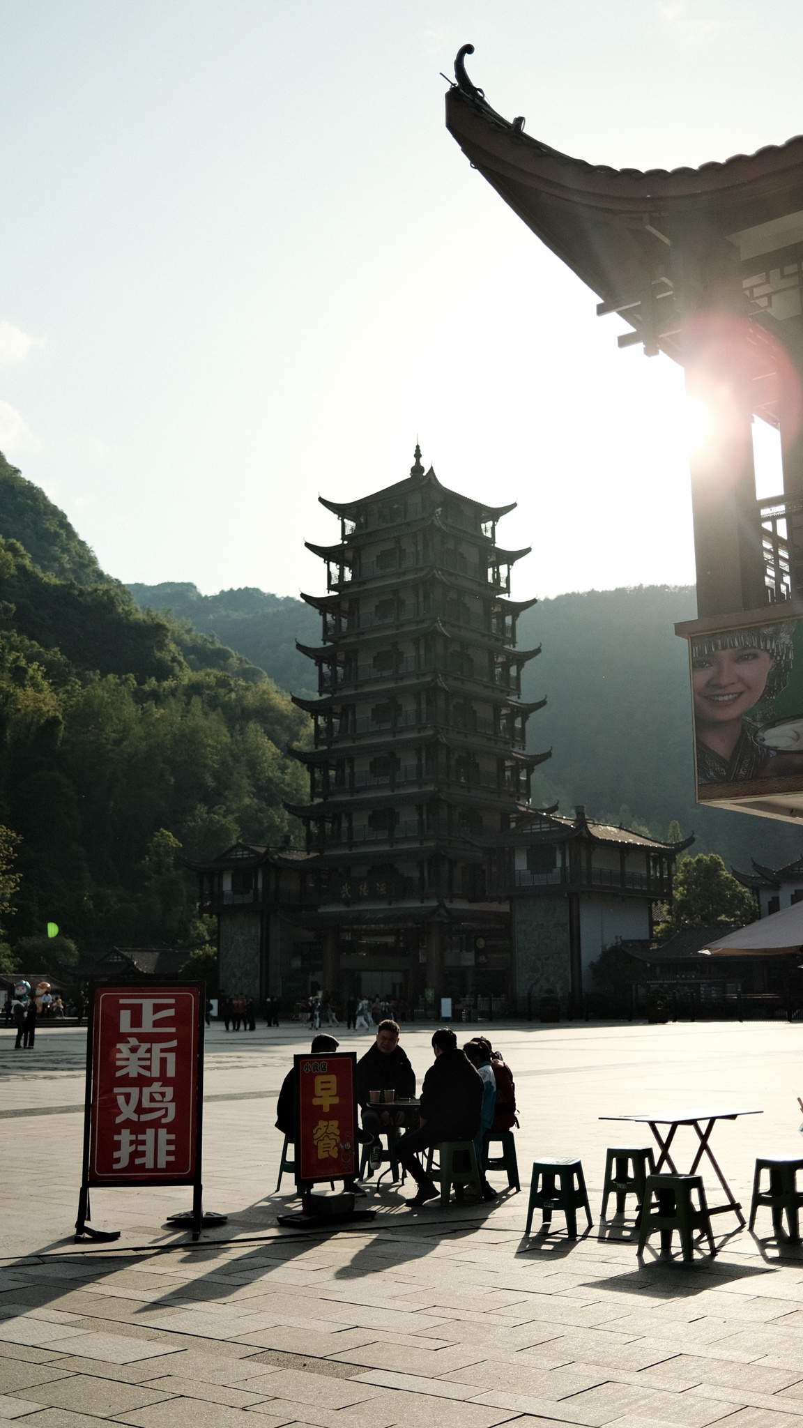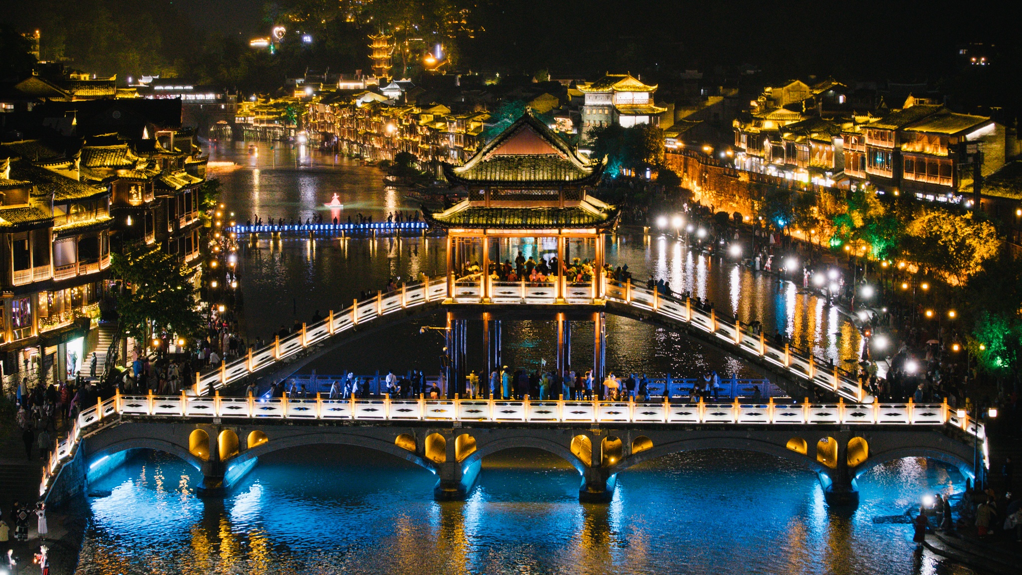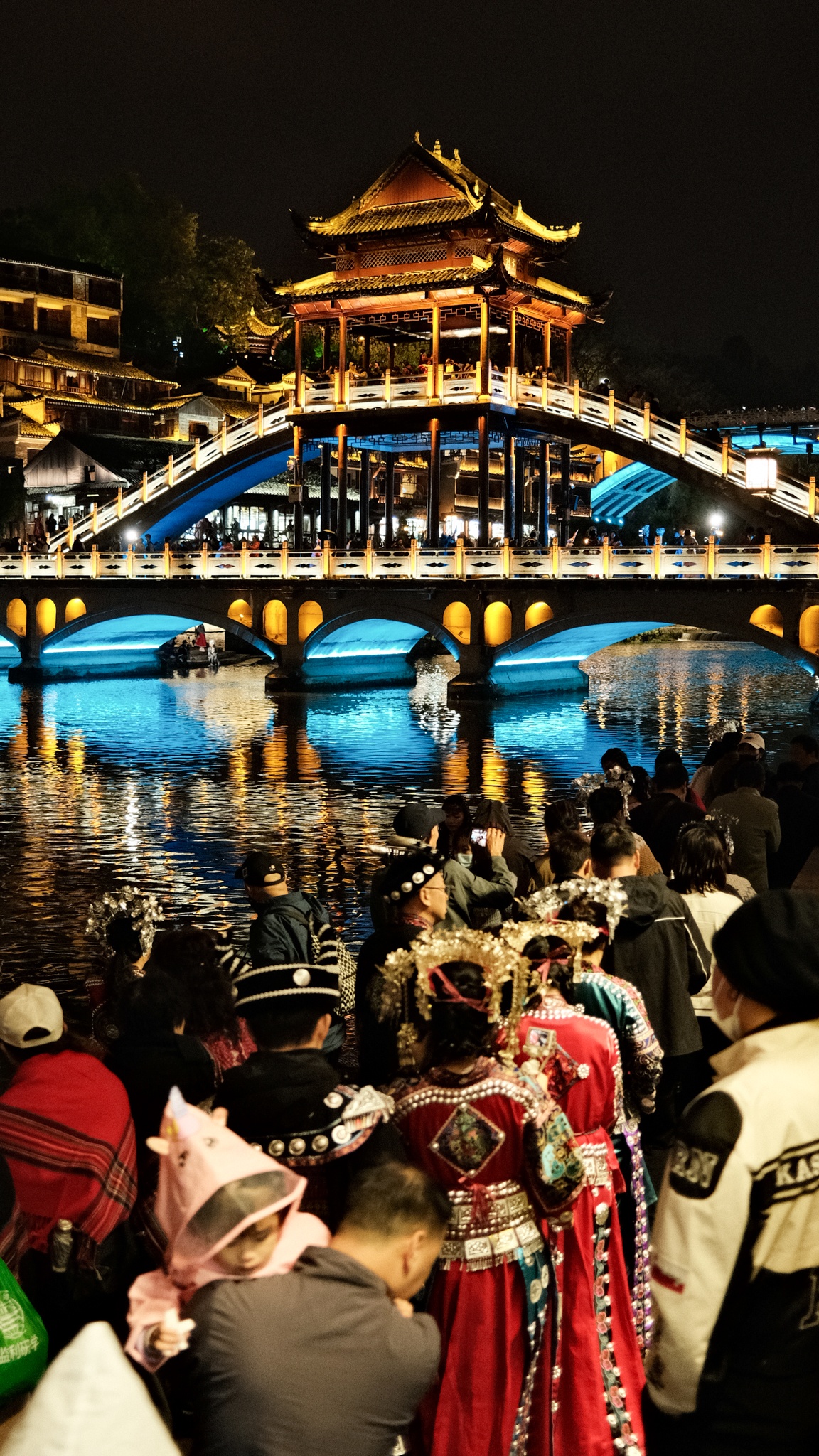 | Buổi chiều, đoàn chúng tôi di chuyển đến Phượng Hoàng cổ trấn, điểm chính của hành trình. Năm 2019, tôi dẫn tới 3-4 đoàn khách/tháng. 3 năm mới quay lại, cổ trấn 1.300 tuổi bên cạnh dòng Đà Giang vẫn giữ nguyên vẻ đẹp cổ kính. Hai bên sông được lắp đặt thêm hệ thống phun sương và phun nước, tạo cảm giác huyền ảo. |