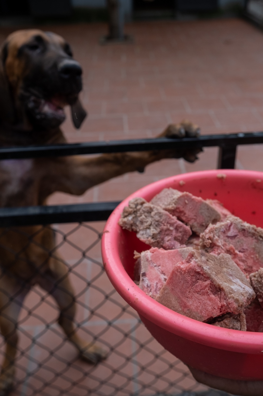 | Mỗi chú chó thường chỉ ăn một bữa/ngày. Thức ăn là thịt sống và hạt xen kẽ. Nhiều người cho rằng ăn thịt sống sẽ khiến chó hung dữ nhưng không phải vậy. Các chất ở thịt sống chưa qua chế biến sẽ mang lại nguồn dinh dưỡng tốt hơn và làm hệ tiêu hoá khoẻ mạnh hơn. Chó chỉ bị kích động khi bản thân nó tiếp xúc trực tiếp với máu tươi. |