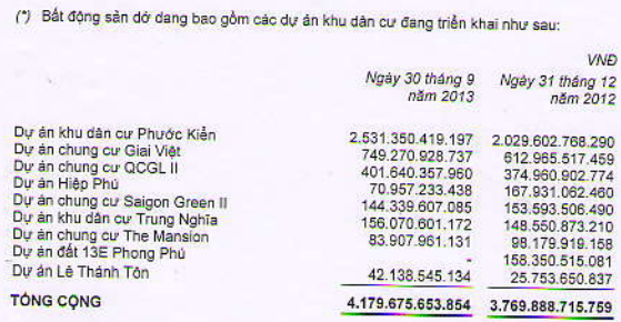 Phần lớn tồn kho của QCG là bất động sản dở dang (4.180 tỷ đồng). Trong đó, đáng kể nhất là Dự án Khu dân cư Phước Kiển với giá trị dở dang lên tới 2.531 tỷ đồng. Được biết, dự án này cùng với dự an Giai Việt đã được thế chấp Ngân hàng cho các khoản vay.
