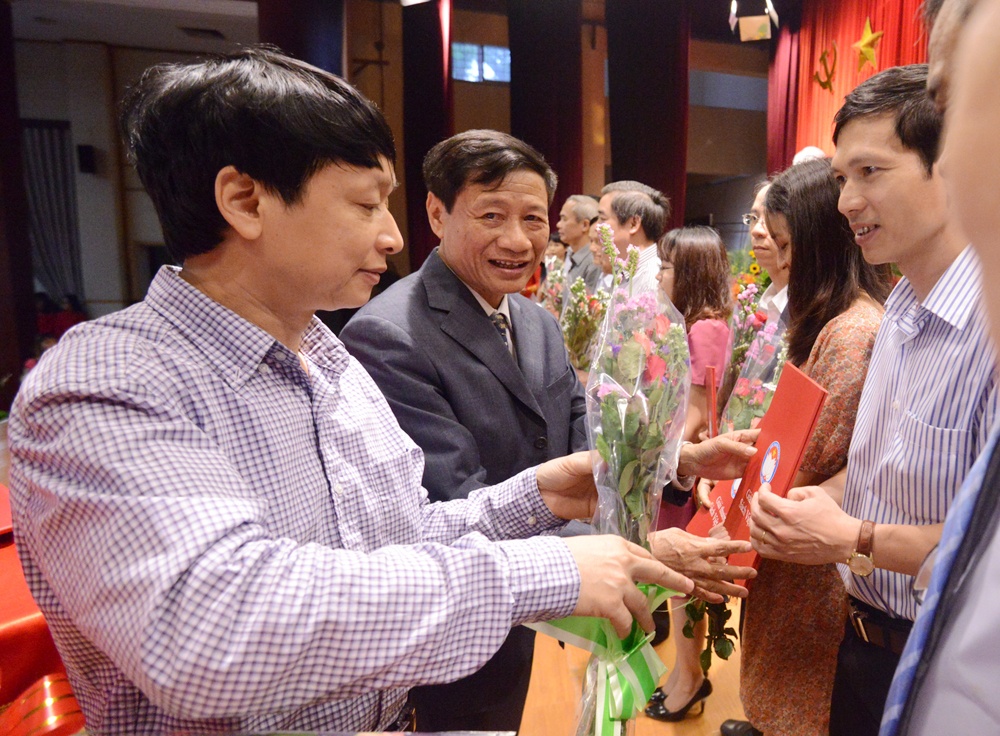 | Các tác giả lên nhận giải thưởng sách đẹp sáng nay. Ảnh: Lê Hiếu. |