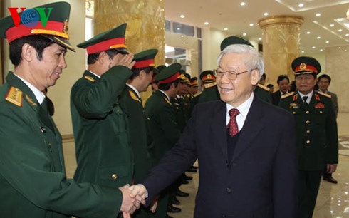 Phát biểu tại buổi làm việc, thay mặt Bộ Chính trị, Ban Bí thư, Quân ủy Trung ương, Tổng bí thư Nguyễn Phú Trọng gửi lời chúc tốt đẹp nhất tới cán bộ, chiến sĩ, công nhân viên, lực lượng vũ trang Thủ đô nhân dịp năm mới 2016.