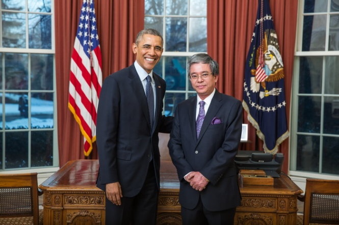 | Tân đại sứ Việt Nam tại Hoa Kỳ Phạm Quang Vinh và Tổng thống Barack Obama tại buổi lễ trình quốc thư diễn ra ở Nhà Trắng ngày 23/2. |