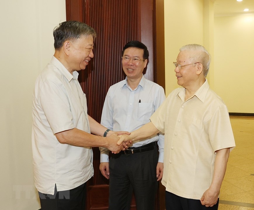 | Tổng bí thư Nguyễn Phú Trọng, Thường trực Ban Bí thư Võ Văn Thưởng và Bộ trưởng Công an Tô Lâm tại phiên họp của Ban Chỉ đạo ngày 18/7. Ảnh: TTXVN. |