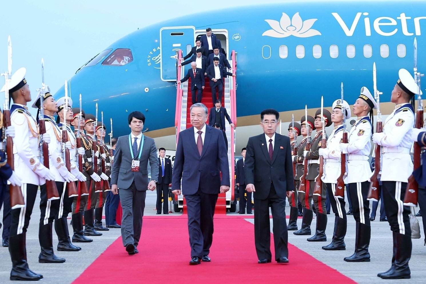 Tại sân bay quốc tế Bình Nhưỡng, hai hàng tiêu binh danh dự đứng dọc hai bên thảm đỏ. Ủy viên dự khuyết Bộ Chính trị, Ủy viên Quốc vụ, Trưởng ban Quốc tế - Ban Chấp hành Trung ương Đảng Lao động Triều Tiên, Kim Song Nam chào đón Tổng Bí thư Tô Lâm tại chân cầu thang máy bay. Thiếu nữ Triều Tiên tặng hoa Tổng Bí thư Tô Lâm