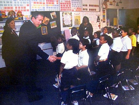 Ngày 11/9/2001, khi hàng triệu người theo dõi trực tiếp cảnh máy bay thứ hai lao thẳng Trung tâm Thương mại Thế giới (WTC) ở thành phố New York, Tổng thống George Bush đang dự giờ ở lớp học CE1 của trường tiểu học Emma E. Booker, quận Sarasota, bang Florida. Trong ảnh, Bush bắt tay em Lazaro Dubrocq, 7 tuổi. Ảnh: ABCNews