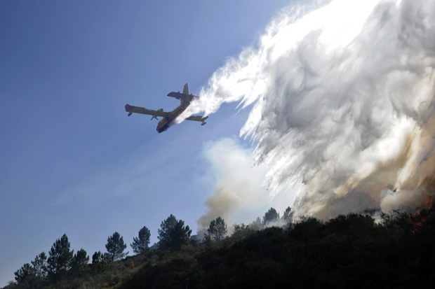 | Máy bay thả nước xuống đám cháy rừng gần thành phố Penoita ở miền trung Bồ Đào Nha. Ảnh: AFP. |