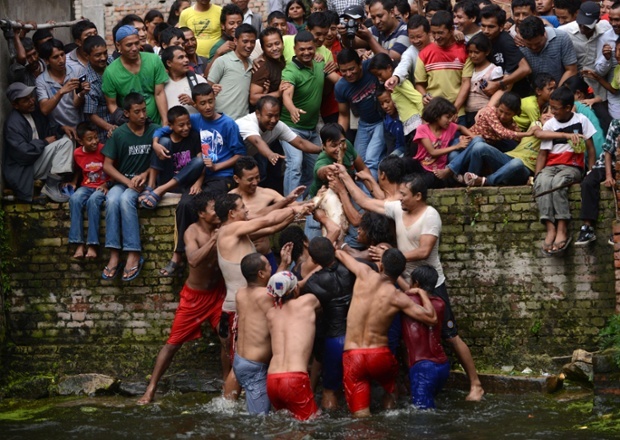 | Hàng chục người dân Nepal đua nhau tóm một con dê trong một lễ hội truyền thống ở làng Khonkana, ngoại ô thành phố Kathmandu. Ảnh: AFP. |