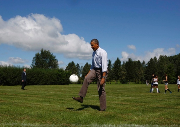 | Ông chủ Nhà Trắng trình diễn kỹ năng tâng quả bóngkhi ông gặp các cầu thủ của trường trung học Tully, thành phố Tully, bang New York hôm 23/8. Ảnh: Reuters. |