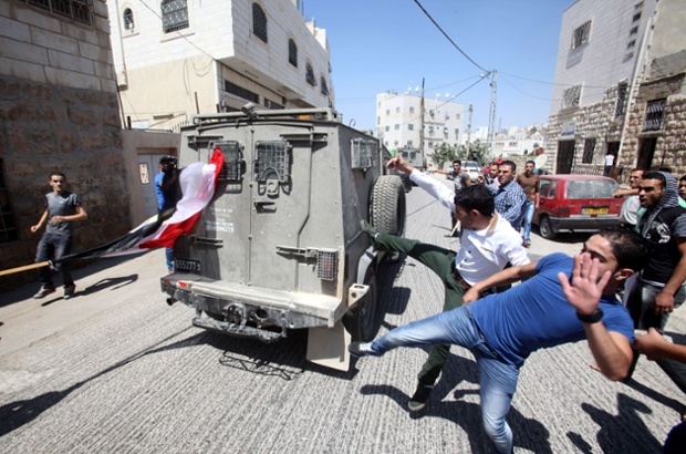 | Những thanh niên Palestine đá một xe quân sự Israel trong cuộc biểu tình nhằm thể hiện sự ủng hộ đối với cựu tổng thống Ai Cập Mohamed Morsi tại thành phố Hebron thuộc khu Bờ Tây. Ảnh: AFP. |