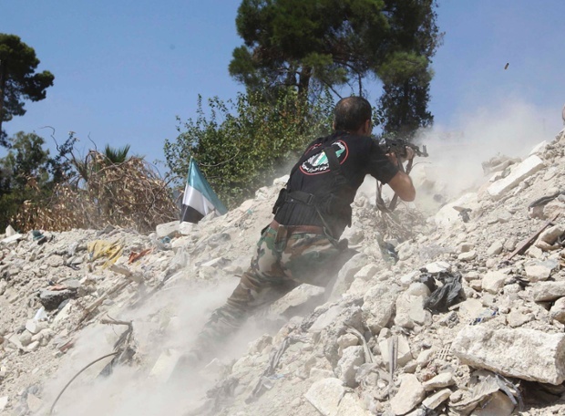 | Một chiến binh thuộc phe đối lập tại Syria đọ súng với lính chính phủ gần một nhà thờ cổ trong thành phố Aleppo. Ảnh: Reuters. |
