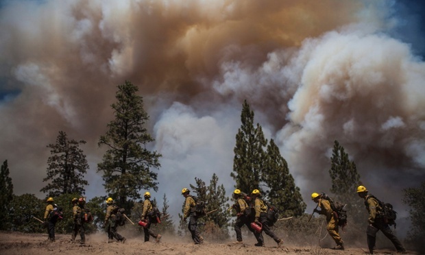 | Đoàn nhân viên cứu hỏa chuẩn bị dập đám cháy rừng gần thành phố Groveland, bang California. Đây là một trong gần 50 đám cháy đang hoành hành khắp nước Mỹ. Ảnh: Reuters. |
