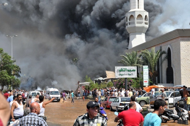 | Khói bốc lên phía sau một giáo đường sau khi một quả bom nổ tại thành phố Tripoli, Lebanon. Đây là một trong hai vụ nổ tại Tripoli khiến 13 người chết và hơn 50 người bị thương vào hôm 23/8. Ảnh: AFP. |