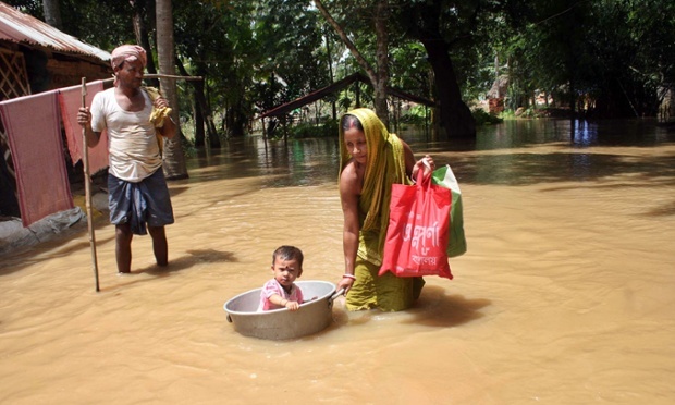 | Người mẹ đặt con vào chậu để di chuyểnkhi nước lũ tràn vào làng Gobindapur, bang West Bengal, Ấn Độ. Ảnh: AP. |