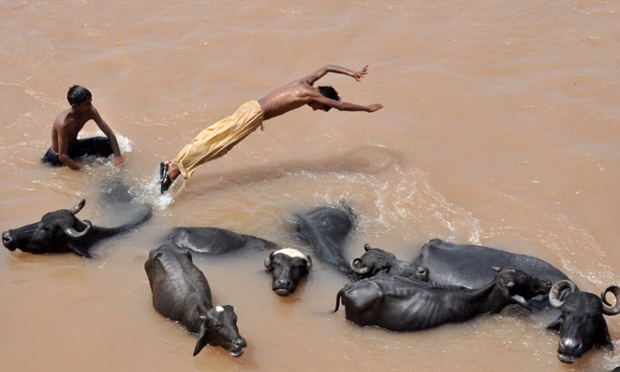 | Thanh niên Ấn Độ nhảy từ lưng trâu khi đàn trâu tắm trong sông Tawi ở bang Jammu và Kashmir. Ảnh: AFP. |