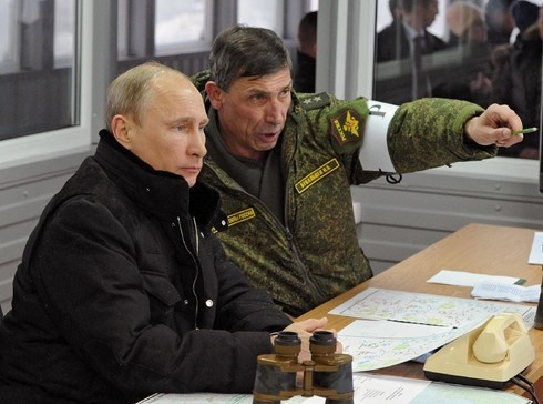 | Tổng thống Nga Vladimir Putin lắng nghe tướng Ivan Buvaltsev khi hai ông theo dõi cuộc tập trận gần thành phố St. Petersburg hôm 3/3. Ảnh: RIA Novosti |