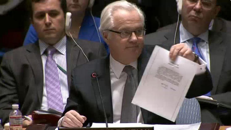 | Ông Vitaly Churkin, Đại sứ Nga tại Liên Hiệp Quốc, công bố bản sao của thư mà Viktor Yanukovych gửi tới Điện Kremlin trong phiên họp của Hội đồng Bảo an tại thành phố New York hôm 3/3. Ảnh: Reuters |