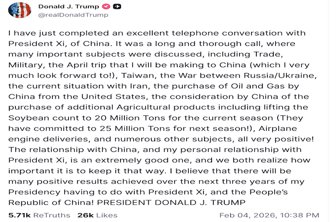 Các cuộc trao đổi của ông Tập với lãnh đạo Nga và Mỹ diễn ra trong bối cảnh căng thẳng giữa Mỹ và Iran gia tăng, đồng thời các nỗ lực nhằm chấm dứt chiến tranh tại Ukraine đang được thúc đẩy, khi vòng đàm phán ba bên giai đoạn hai giữa Kyiv, Moskva và Washington bắt đầu tại thủ đô Abu Dahbi của Các Tiểu vương quốc Arab Thống nhất (UAE) vào ngày 4/ 2.