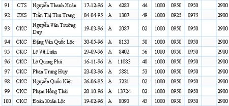Danh sách gồm 50 thí sinh ĐH và 50 thí sinh CĐ. Tính cả hai hệ, mức điểm cao nhất đạt 29,75 điểm, thấp nhất 28,25 điểm. Theo đó, có hai thí sinh đạt mức điểm 29,75 là Nguyễn Thu Thảo (CĐ Sư phạm Quảng Ninh, thi khối A); Nguyễn Nhật Long (CĐ Công nghiệp Phúc Yên, thi khối A).