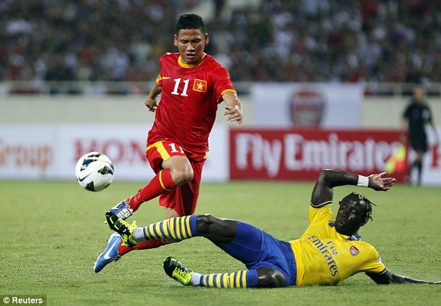 Arsenal là đội bóng Ngoại hạng Anh đầu tiên chọn Việt Nam làm điểm du đấu. HLV Arsene Wenger không thể mang sang đội trưởng Thomas Vermaelen nhưng hàng loạt ngôi sao khác như Theo Walcott, Mikel Arteta, Wilshere, Giroud, Sagna… đều có mặt. Arsenal dễ dàng đánh bại ĐTVN 7-1, bàn thắng duy nhất của Việt Nam thuộc về tiền vệ Trần Mạnh Dũng. Ngoài không khí sôi động trên khán đài, Arsenal đã khuấy động không khí bóng đá ở bất cứ nơi nào họ đến trong những ngày dừng chân tại Hà Nội. Đặc biệt, việc “Running man” Vũ Xuân Tiến chạy 5 km theo xe đội bóng nước Anh đã được truyền thông quốc tế quan tâm đặc biệt, tạo nên hình ảnh về đất nước, con người Việt Nam. Ảnh: Reuters. |