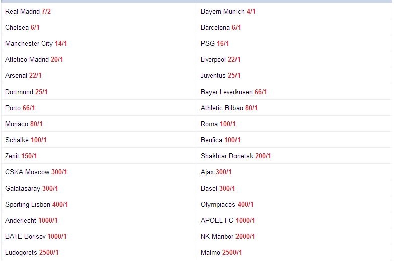 *Mức đặt cược của nhà cái Skybet dành cho khả năng vô địch của 32 đội bóng tham dự Champions League 2014/15.