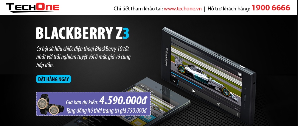 BlackBerry Z3 có thiết kế vuông vức và nam tính. Màn hình 5 inch, phân giải qHD, vi xử lý Qualcomm Snapdragon lõi kép 1,2 GHz, RAM 1,5 GB. Điện thoại sở hữu camera chính độ phân giải 5 megapixel, camera phụ độ phân giải 1,1 megapixel. Máy có hệ điều hành BlackBerry 10.2.1 mới nhất và pin 2.500 mAh. TechOne là hệ thống siêu thị chính hãng đã được BlackBerry chọn làm 1 trong những đại lý phân phối Z3 đầu tiên trên thị trường vớigiá dự kiến 4,59 triệu đồng cùng quà tặng trị giá 750.000 đồng. Đặt trước Z3 tại đây từ ngày hôm nay khách hàng có cơ hội nhận nhiều quà khuyến mại và có máy vào đầu tháng 7.