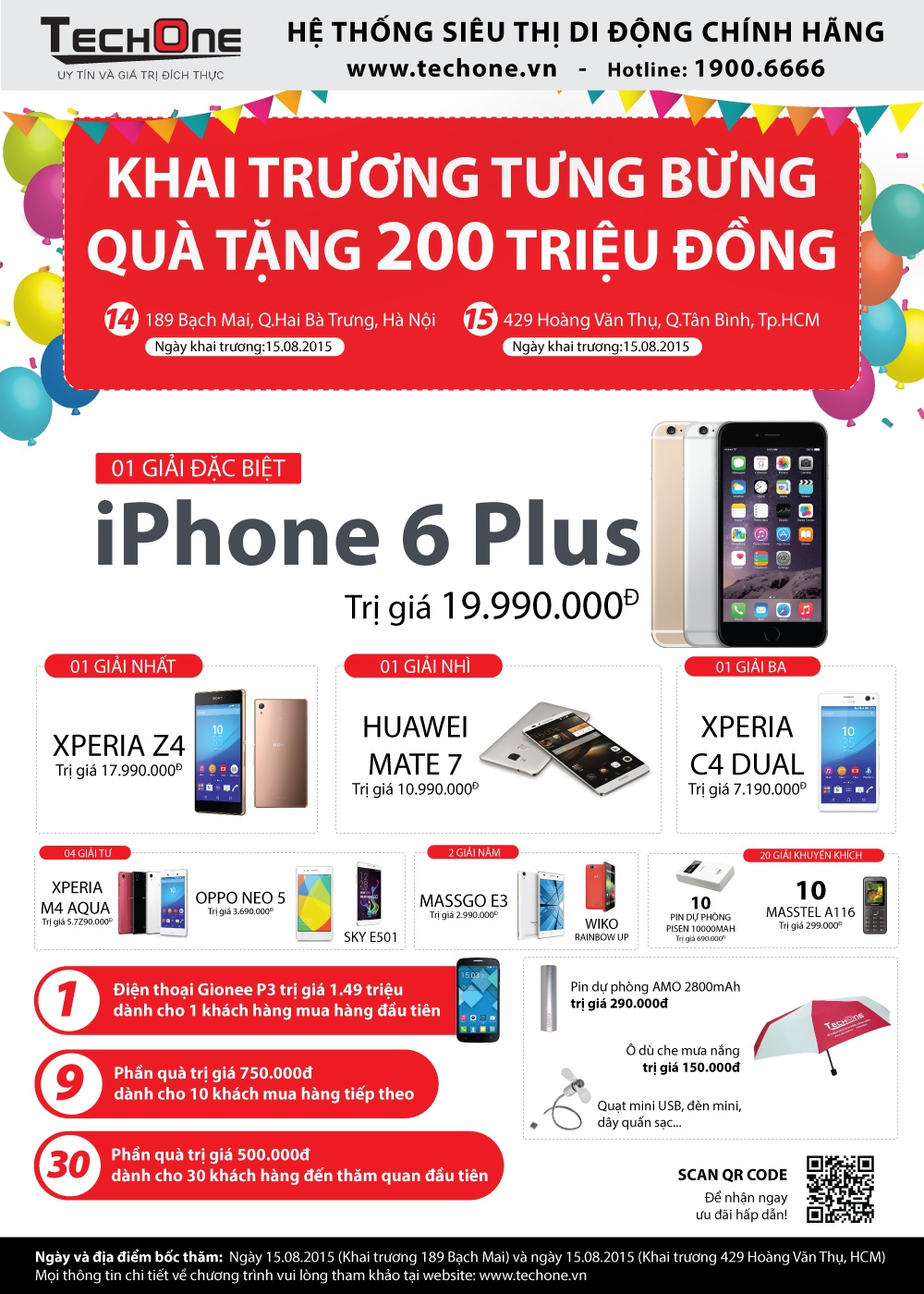 Nhân tháng khai trương 2 siêu thị mới tại 189 Bạch Mai, Hà Nội và 429 Hoàng Văn Thụ, TP HCM, TechOne triển khai loạt chương trình khuyến mãi hấp dẫn, giảm giá điện thoại, phụ kiện tới 50%. Chi tiết xem tại đây.