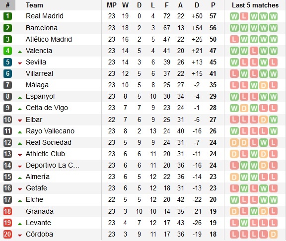 Bảng xếp hạng vòng 23 La Liga 2014/15.