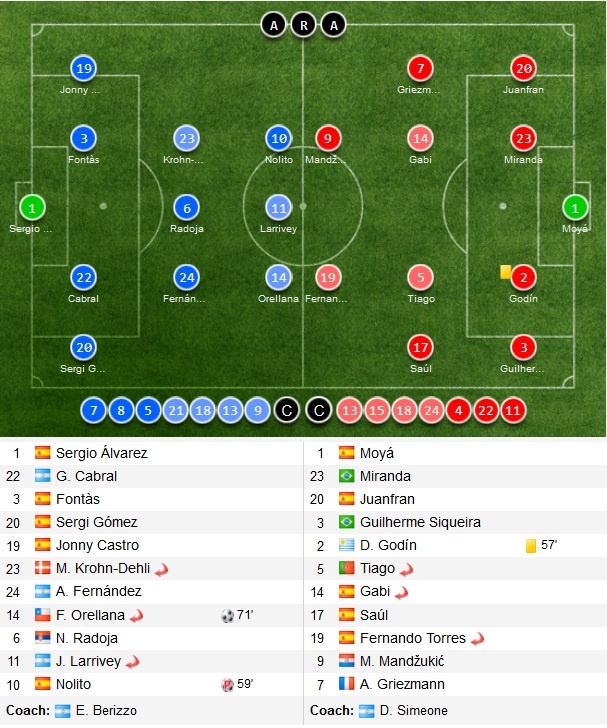 | Đội hình thi đấu giữa Celta Vigo và Atletico Madrid trong khuôn khổ vòng 23 La Liga 2014/15. |