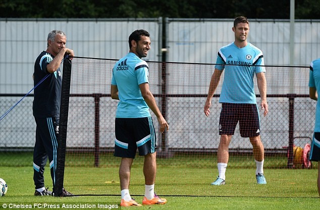 | HLV Jose Mourinho tỏ ra rất hài lòng với bài tập luyện chuyền bóng bằng đầu đầu qua lưới của các học trò. |