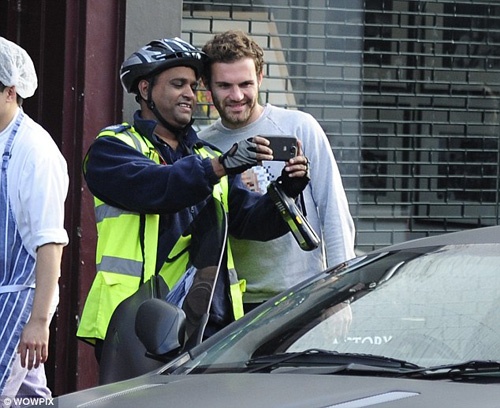 | Sau khi làm xong nhiệm vụ, người cảnh sát còn tranh thủ xin được chụp ảnh chung với Mata, thần tượng bóng đá của mình để làm kỷ niệm. |