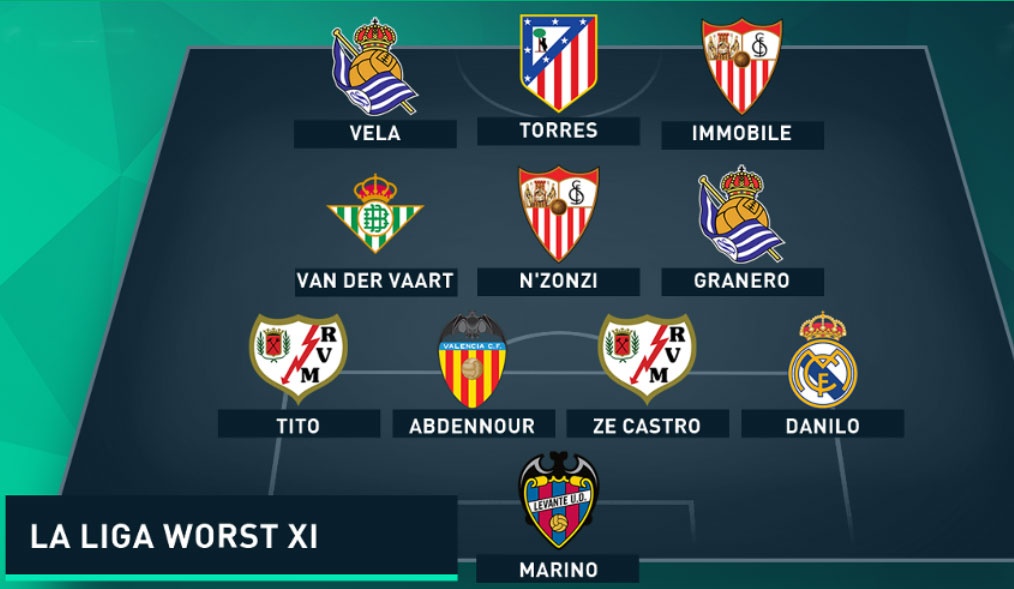 Carlos Vela (tiền đạo): Chân sút người Mexico không đạt hiệu suất ghi bàn như sự kỳ vọng của ban huấn luyện Real Sociedad. Vela có 2 lần làm tung lưới đối phương sau 15 trận. Anh là một trong những cầu thủ gây thất vọng trong đội hình câu lạc bộ xứ Basque. |